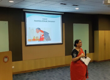 A talk by Mrs. Mrinalini Kher, a renowned social entrepreneur, Hon. Secretary & Trustee of Kherwadi Social Welfare Association (KSWA) and also the moving spirit and co-founder of “Yuva Parivartan (YP)”, a project of KSWA, was organized for the staff on “Awareness of Sexual Harassment of Women at Workplace” from 3.30 to 4.30 pm.